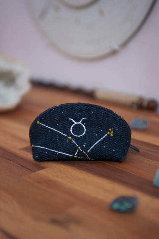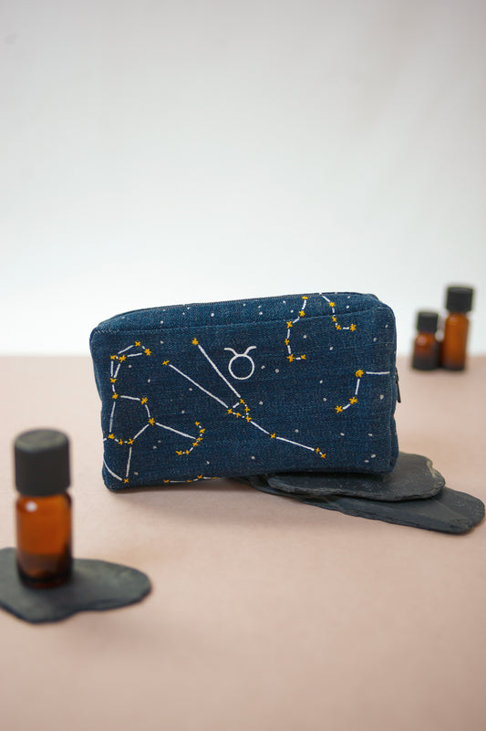 Une petite pochette ou une grande trousse ornementée du symbole de votre signe du zodiaque et de sa constellation pour un produit à l’image de votre ciel de naissance.